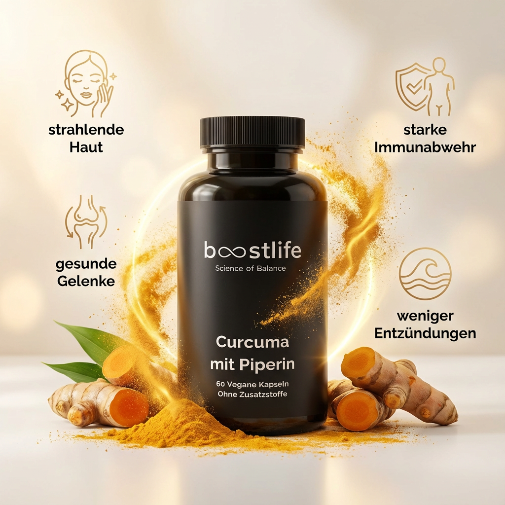 Boostlife Curcuma mit Piperin liefert dir hochdosiertes Curcumin kombiniert mit Piperin – für eine bis zu 20x bessere Aufnahme.